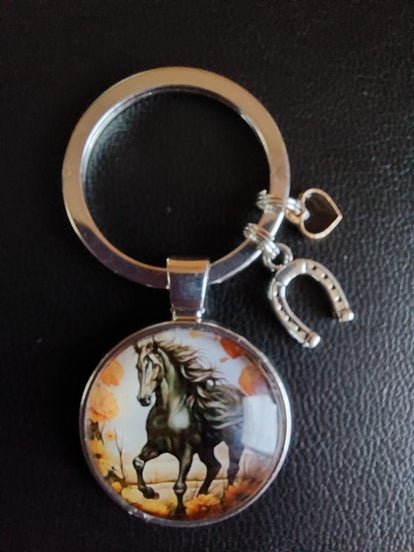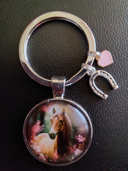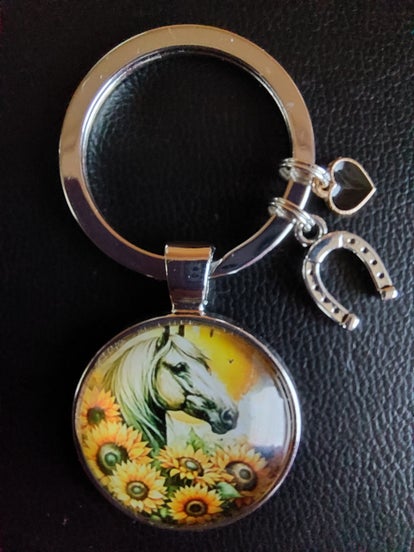 Sleutelhanger is 6 cm lang en bestaat uit een metalen sleutelring met een diameter van 3 cm en een ronde basis waar een glazen cabochon met een diameter van 25mm in zit. De bedels zijn ook van metaal. Leuk om cadeau te geven.